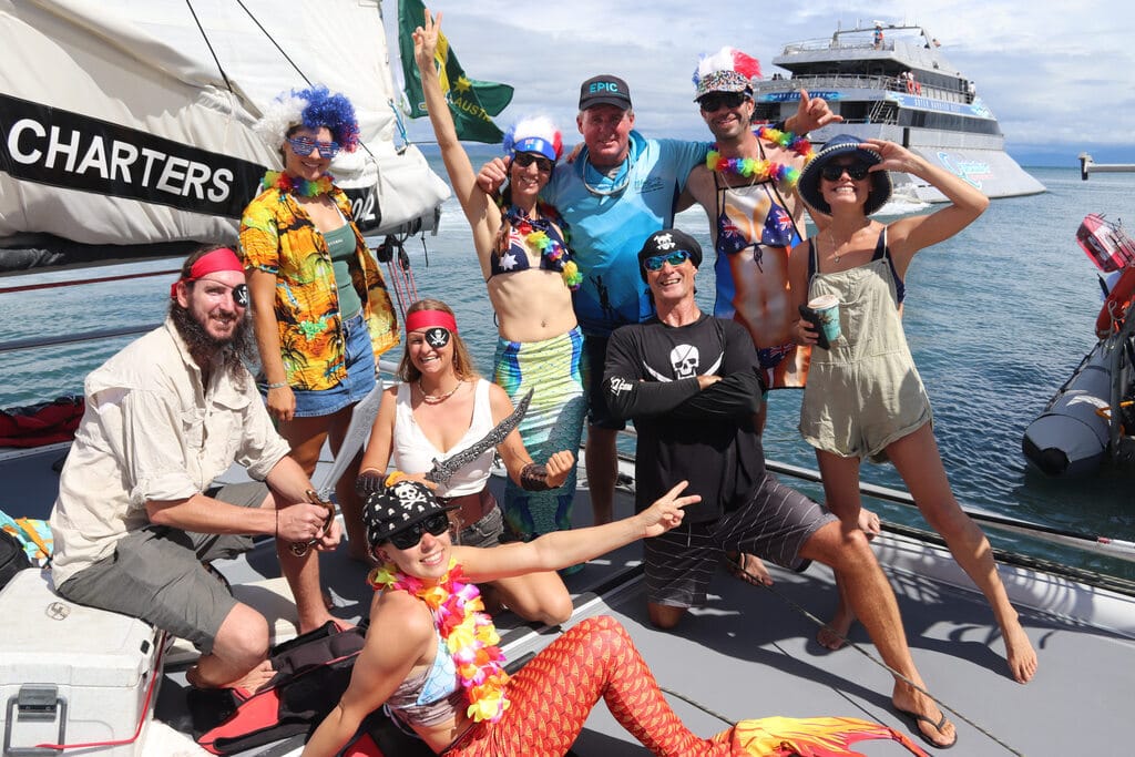 Hundreds of glistening blue scad mackerel leap out of the water in front of our catamaran as we cut through the waves heading out towards Low Isles off the coast of Port Douglas.