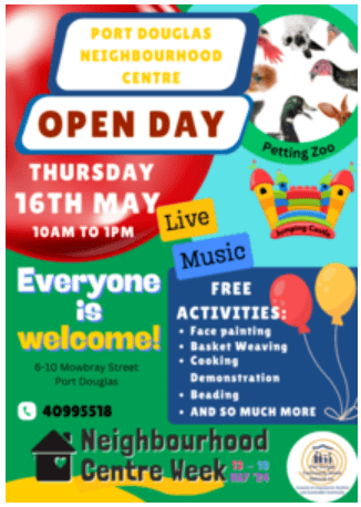 National Neighbourhood Centre Week will be held next week with this years theme being “Stronger Together”.To celebrate the resilience and strength of our community the Port Douglas Neighbourhood Centre will be hosting an Open Day from 10 – 1 on site at 6-10 Mowbray St, Port Douglas.