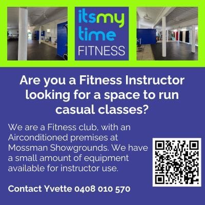 It's My Time Fitness, Mossman Showgrounds, has availability for use of our spacious air conditioned premises, on a casual regular basis. There are flexible options for room hire only, or offering classes promoted on our club timetable.