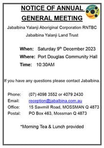 2023 ANNUAL GENERAL MEETING December 9th Details: Jabalbina Yalanji Aboriginal Corporation RNTBC & Jabalbina Yalanji Land Trust Contact Information: Ph (07) 4098 3552 or email - [email protected]