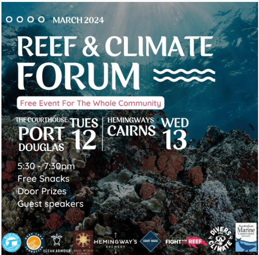 Join our two local Reef & Climate Forums to explore climate solutions and the GBR with us.Summer should be a magical time on the Great Barrier Reef, but this summer, water temperatures are up to two degrees above average, and corals are severely bleaching in some areas.Join us for a drink and a chat as we navigate some tricky conversations about the future of the Reef with some experts.