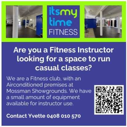 If you are a fitness Instructor looking for a space to run casual classes - contact us! 0408 010 570. We have an airconditioned premises in Mossman fitness precinct overlooking the oval. There's some equipment available for your use in classes, and we assist with marketing. Ideally suited to an instructor with own client base.