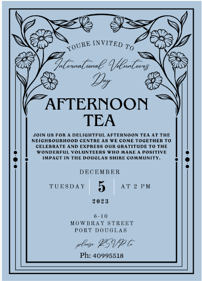 INTERNATIONAL VOLUNTEERS DAY AFTERNOON TEADecember 5thJoin us for a delightful afternoon tea at the Neighbourhood Centre as we come together to celebrate and express our gratitude to the wonderful volunteers who make a positive impact in the Douglas Shire community.Tuesday 5th December 2pm RSVP to 40995518