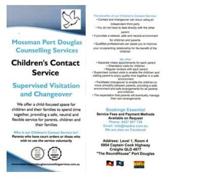 LOCAL SERVICE AVAILABLE IN THE DOUGLAS SHIRE - CHILDREN'S CONTACT SERVICE (SUPERVISED VISITATION AND/OR CHANGEOVER)Mossman Port Douglas Counselling Services (MPDCS), Proudly Awarded the 2023 Global Health & Pharma Mental Health Award: Most Inclusive Counselling Centre - Tropical North QueenslandMPDCS offers a Children’s Contact Service (CCS) in the Douglas Shire. We offer (1) Supervised Visitations and/or (2) ChangeoverMPDCS provides a respectful, understanding and safe environment for our CCS where we can support parents to meet requirements of Court Orders or other directives, assist them with separation and co-parenting difficulties, or facilitate changeover