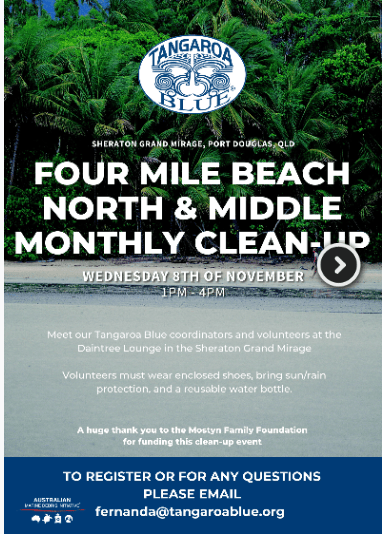 4 MILE BEACH MONTHLY CLEAN-UPNovember 8thWhen: Wednesday 8th November 2023 | 1pm – 4pmWhere: Daintree Lounge at the Sheraton Grand Mirage, Port DouglasTo Register: Please email [email protected]Looking for a way to be part of practical solutions for our environment? Four Mile Beach in Port Douglas is one of our longest-running QLD beach monitoring sites. We have been cleaning and collecting data from this site each month for the past 12 years.