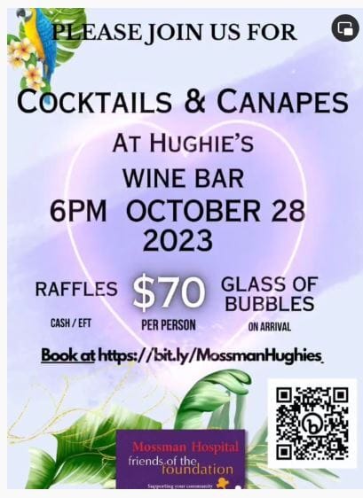 FUNDRAISER!October 28thMossman Hospital Friends of the FoundationDate: Saturday 28 October 2023Time: 6:00pm -Location: Hughie’s Wine Bar MossmamJoin us at Hughie's Wine Bar - Mossman grab some friends and grab your tickets for a great night out in support of our amazing local Mossman Hospital! . Mossman Hospital Friends of the FoundationCost: $70