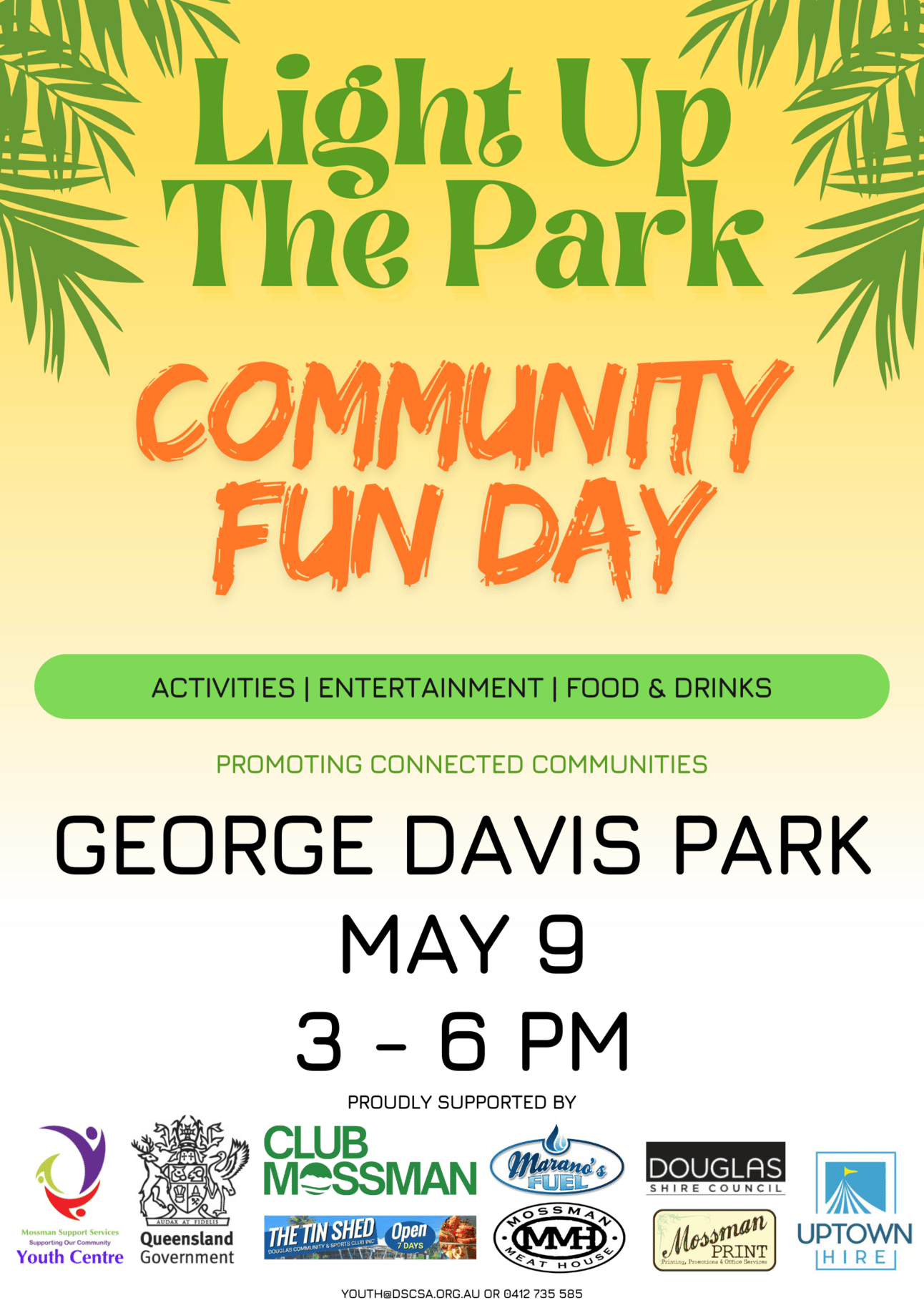 ![]() Light Up The ParkDate: Friday 9 May 2025 Time: 3pm - 6pm Location: George Davis Park, 6 Foxton Ave, Mossman ![]() | ![]() Monthly Social DancingDate: Friday 9 May 2025 Time: 6:30pm - 9:30pm Location: PULLMAN SEA TEMPLE RESORT ![]() |