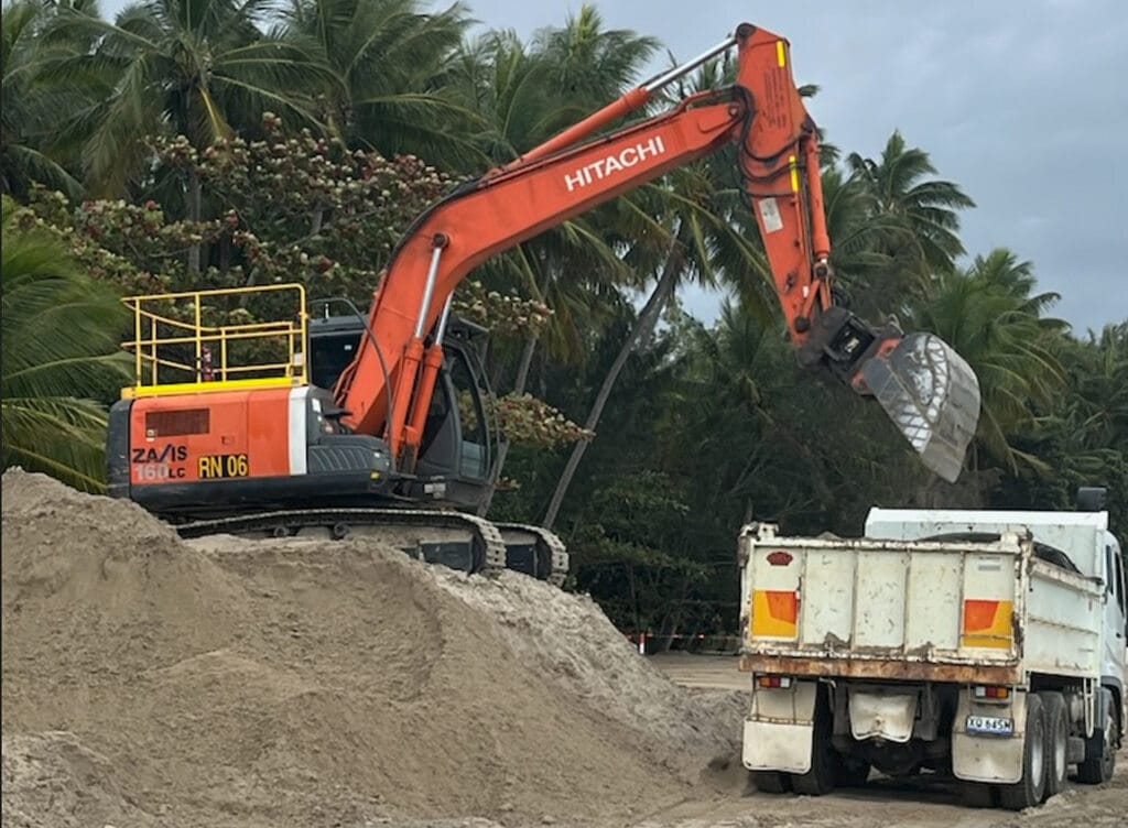 Trucks began carting sand through Four Mile Beach Park this week, and excavators started spreading it around Four Mile Beach, as part of recently announced sand-replenishment works.