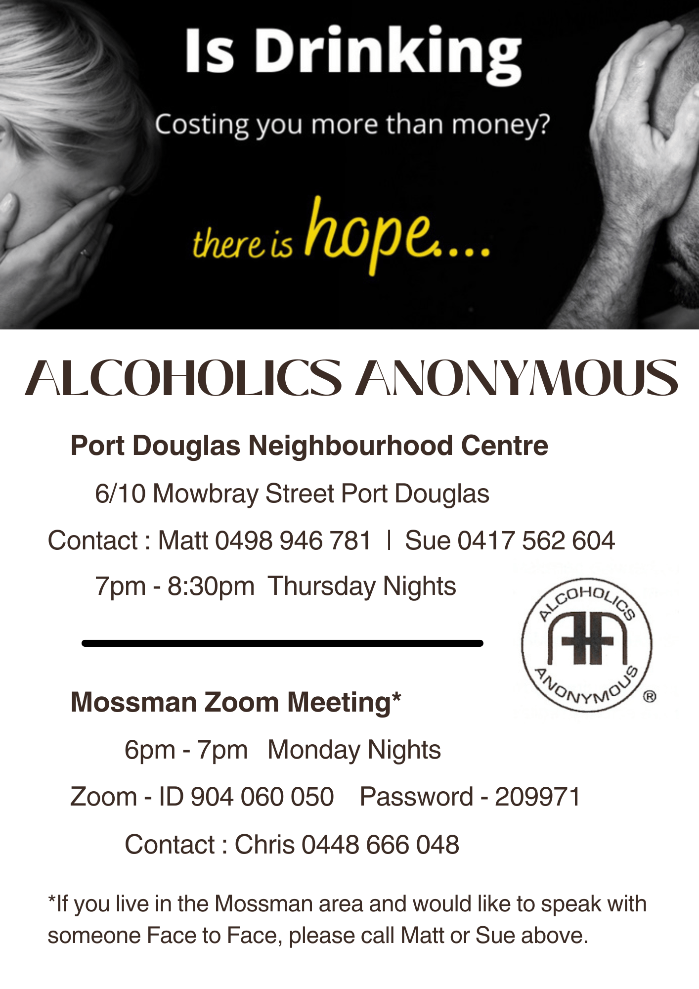 AA meetings in Port Douglas are Open Meetings. Anyone is welcome to come along. We offer a warm, friendly and safe environment for anyone struggling with Alcohol.