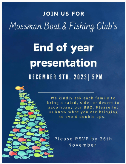 END OF YEAR PRESENTATIONDecember 9thIt's this time of year again...Join us for Mossman Boat & Fishing Club's End of year presentationDecember 9th, 2023 5PMWe kindly ask each family to bring a salad, side, or desert to accompany our BBQ.Please let us know what plate you are bringing to avoid double ups.