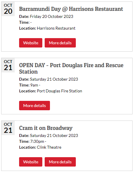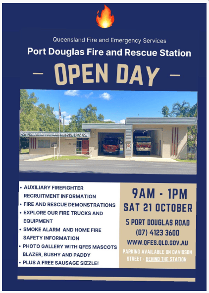 PORT DOUGLAS FIRE AND RESCUE STATION OPEN DAYOCTOBER 21See you on Saturday!Queensland Fire and Emergency Services• Auxiliary Firefighter Recruitment Information• Fire And Rescue Demonstrations• Explore Our Fire Trucks And Equipment• Smoke Alarm And Home Fire Safety Information• Photo Gallery with Qfes Mascots Blazer, Bushy and Paddy