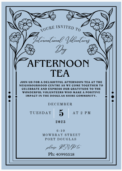 INTERNATIONAL VOLUNTEERS DAY AFTERNOON TEADecember 5thJoin us for a delightful afternoon tea at the Neighbourhood Centre as we come together to celebrate and express our gratitude to the wonderful volunteers who make a positive impact in the Douglas Shire community.