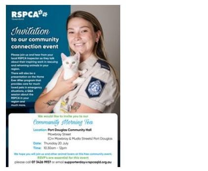 RSPCA MORNING TEA - PORT DOUGLASJuly 20th - 10.30AMWe are hosting our first event in Port Douglas on Thursday 20th July at 10.30am. This will be a morning tea where you will meet like minded animal lovers.At the morning tea will be tell you how the RSPCA Queensland is active in the Port Douglas community. We will also have a local RSPCA Inspector attend the morning tea who will let you know about her role in the local community and share some of her recent experiences with you.
