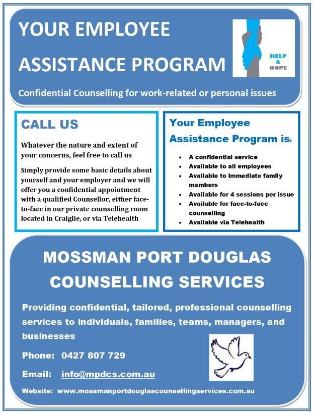 NEW SERVICE NOW AVAILABLE IN THE DOUGLAS SHIRE: FOR BUSINESS OWNERS AND ORGANISATIONSMossman Port Douglas Counselling Services offers to collaboratively work with local businesses and organisations to provide a tailored Employee Assistance Program (EAP)- We do NOT charge any up front fees- There are NO annual fees- NO monthly fees- We invoice on each session